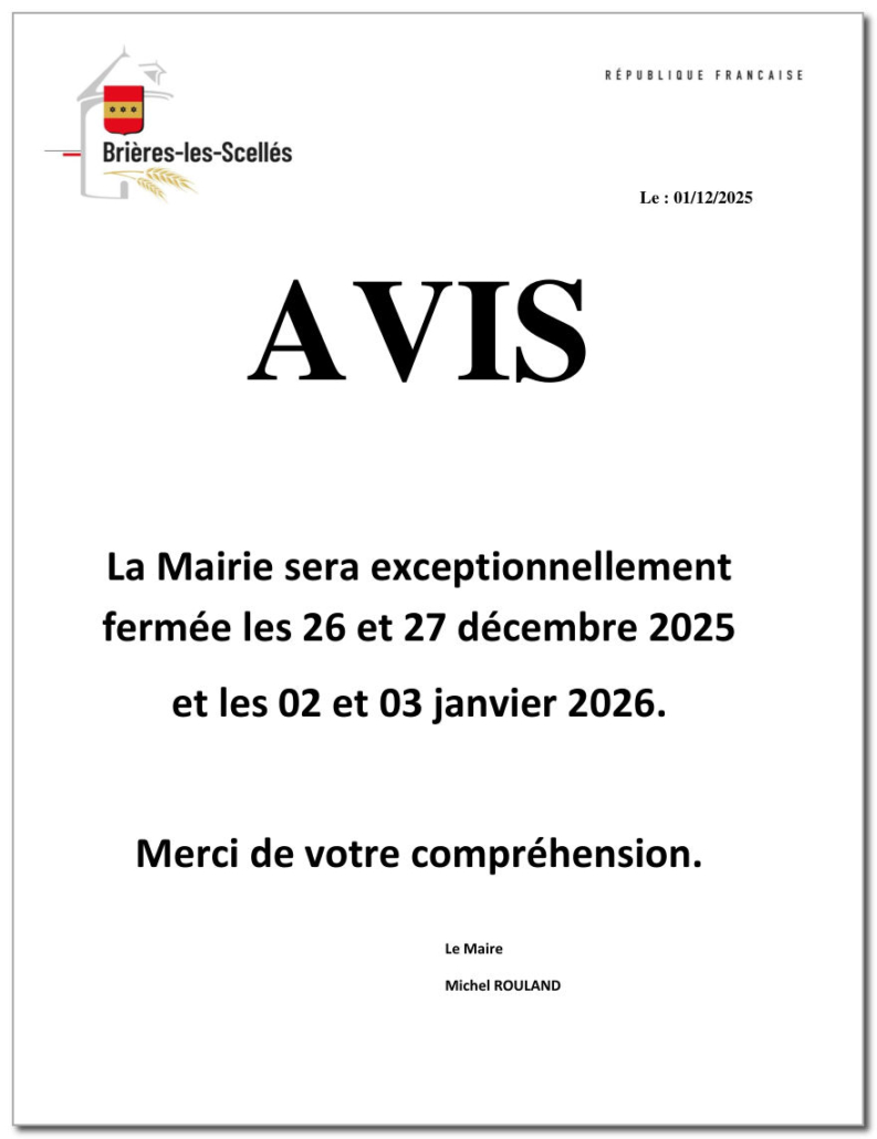 Vous êtes ici : Accueil1 / Actualités2 / Fermeture exceptionnelle de la mairie de Brières – fin 2025