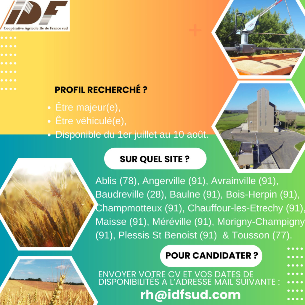 La coopérative agricole Ile de France Sud, spécialisée dans la collecte de céréales, recherche actuellement une trentaine de saisonniers pour la campagne de moisson d’été sur une période allant de fin juin à mi-août 2026.